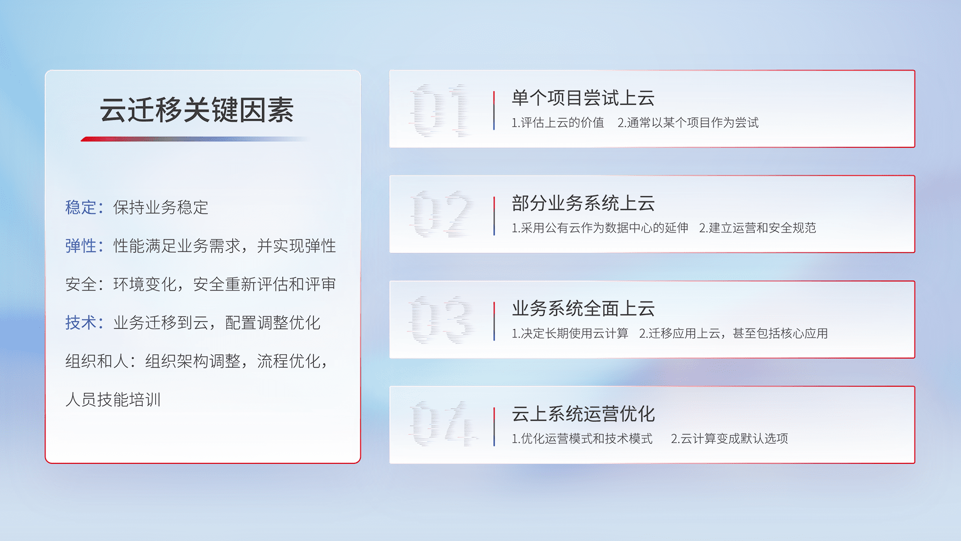 结合实际业务,,,从规划设计、、、、云平台选型、、、云原生改造、、、、数据迁移、、、集成交付,,,迁移全过程为客户识别最佳上云路径,,做好风险识别管理,,,设计网络架构、、、身份权限、、、、安全审计合规、、、操作审计、、、日志审计、、监控告警策略、、、多站点容灾设计等,,,,对云上基础设施进行整体规划,,,提升IT治理水平,,,以满足弹性、、、高可用、、、高性能的需求。。