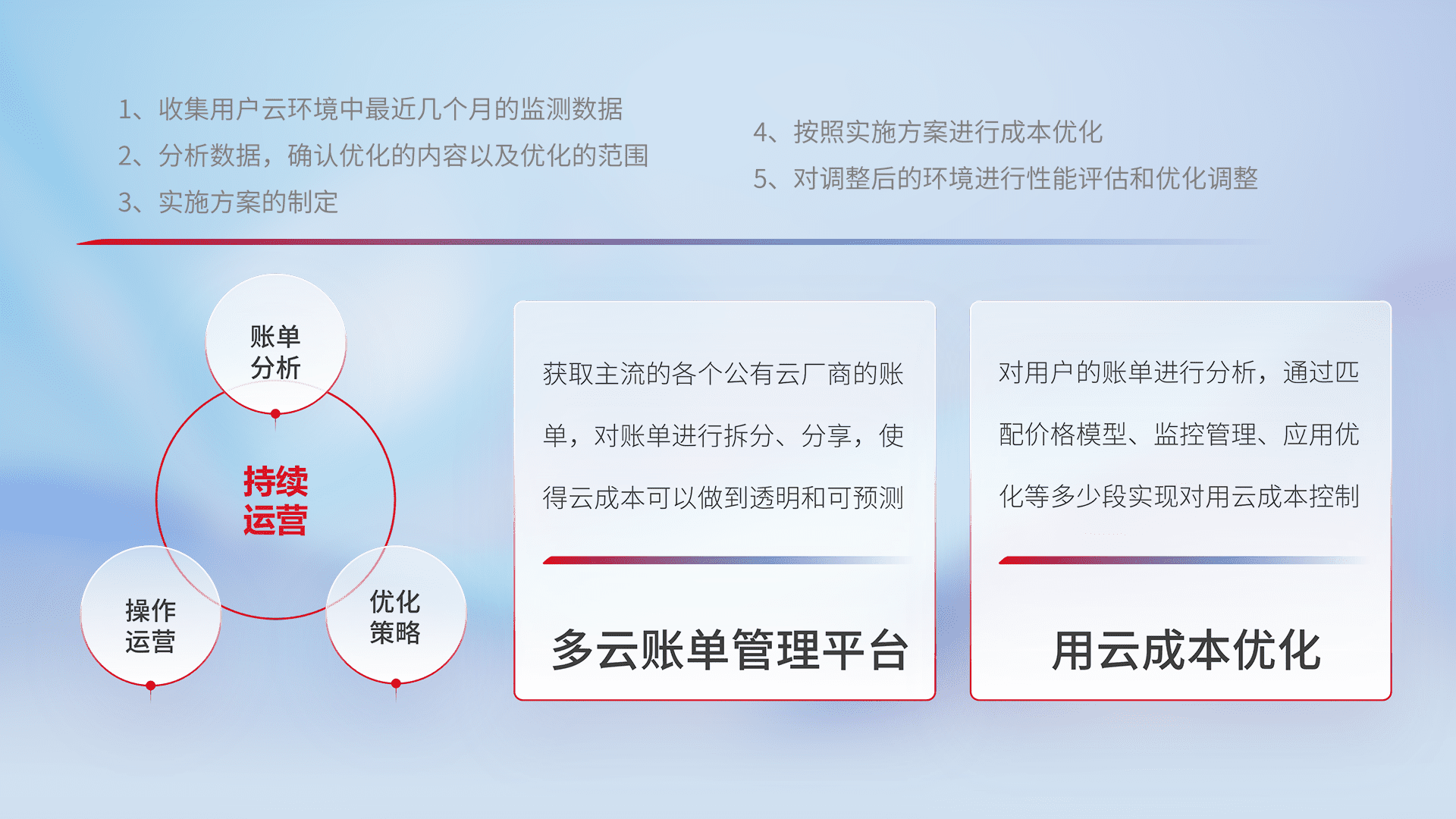 通过多云纳管,,,,以统一的资源数据模型把客户的云资源进行抽象和封装,,,,进而实现对多云资源的统一操作,,保障云资源管理的可靠性、、稳定性与可用性。。。量身定制化运维内容,,,,配置、、、、开发运维、、、补丁管理、、备份、、监控、、、认证和访问管理、、、、审计和日常巡检等,,,保障在用云过程中的可靠度,,,稳定度以及高可用率。。。。